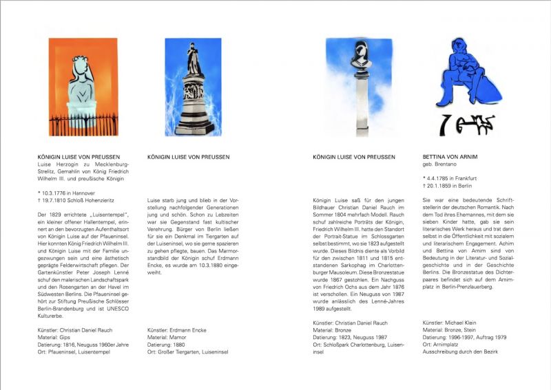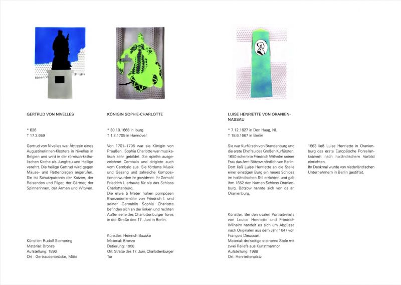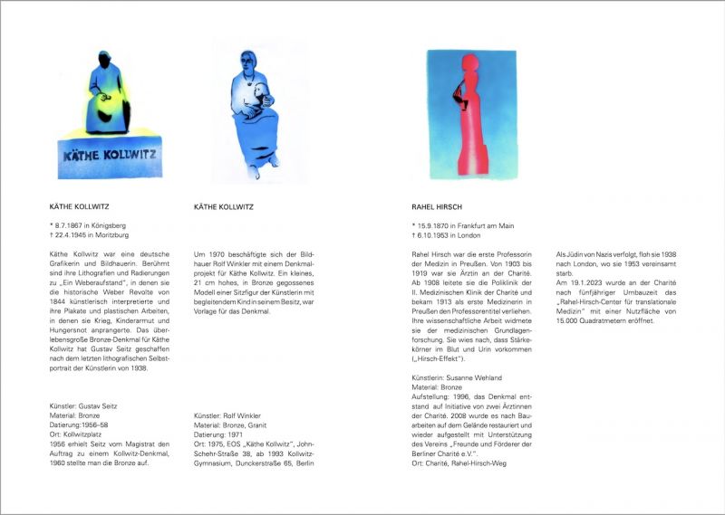 Die erste Publikation von Frauke Beeck mit dem Titel „Frauensleute / Spraybilder“ erschien 2020 und umfasste acht historischen Frauenstatuen im öffentlichen Raum Bremens. Sie bildete den Auftakt für eine Reihe von kleinen Publikationen über Frauendenkmäler im öffentlichen Raum auch in anderen Städten Deutschlands. Im vorliegenden zweiten Band diese Reihe beschäftigt sie sich mit Denkmälern von Frauen in Berlin. Diese Frauen sind zwar mit einem Denkmal im öffentlichen Raum vertreten, doch sind ihre Schicksale und Errungenschaften oft zu wenig bekannt. Frauke Beeck erinnert mit Skizzen, Zeichnungen und kleinen Bildern künstlerisch und atmosphärisch an die Leistungen und persönlichen Geschichten dieser Frauen, ohne sie zu illustrieren. Als künstlerisches Projekt angedacht, bilden diese Publikationsreihe auch eine Dokumentation der historischen Statuen von Frauen im öffentlichen Raum.